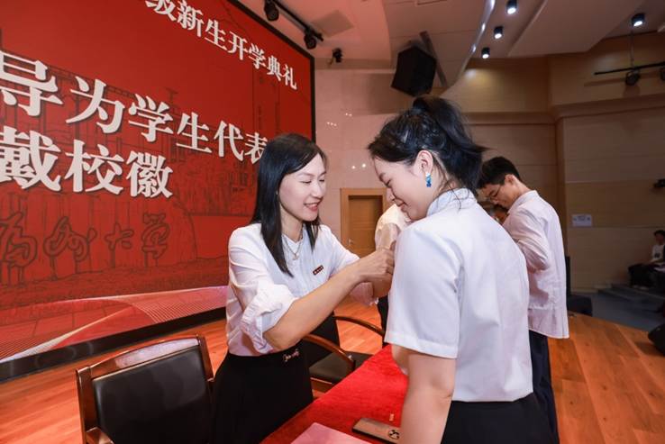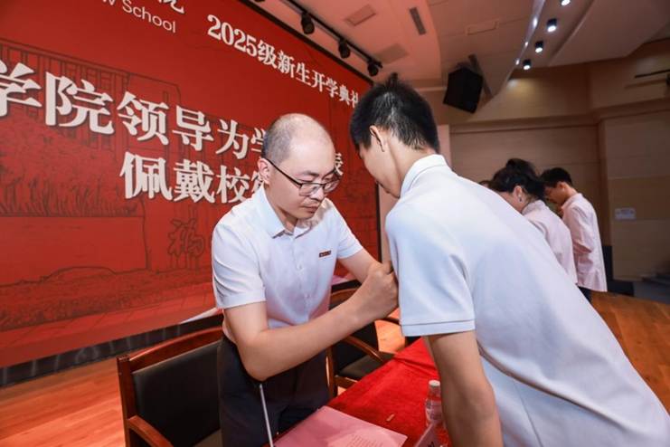 典礼开篇,全体师生肃立,奏唱国歌。激昂的旋律中,开学典礼正式拉开帷幕。伍宇翔副书记向来自全国各地的新生表示热烈欢迎,并介绍了出席本次开学典礼的各位领导与老师。随后,在持久的掌声中,院领导为新生代表佩戴校徽。