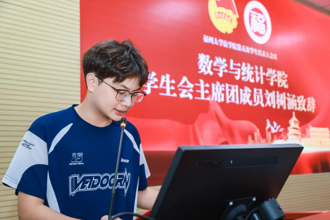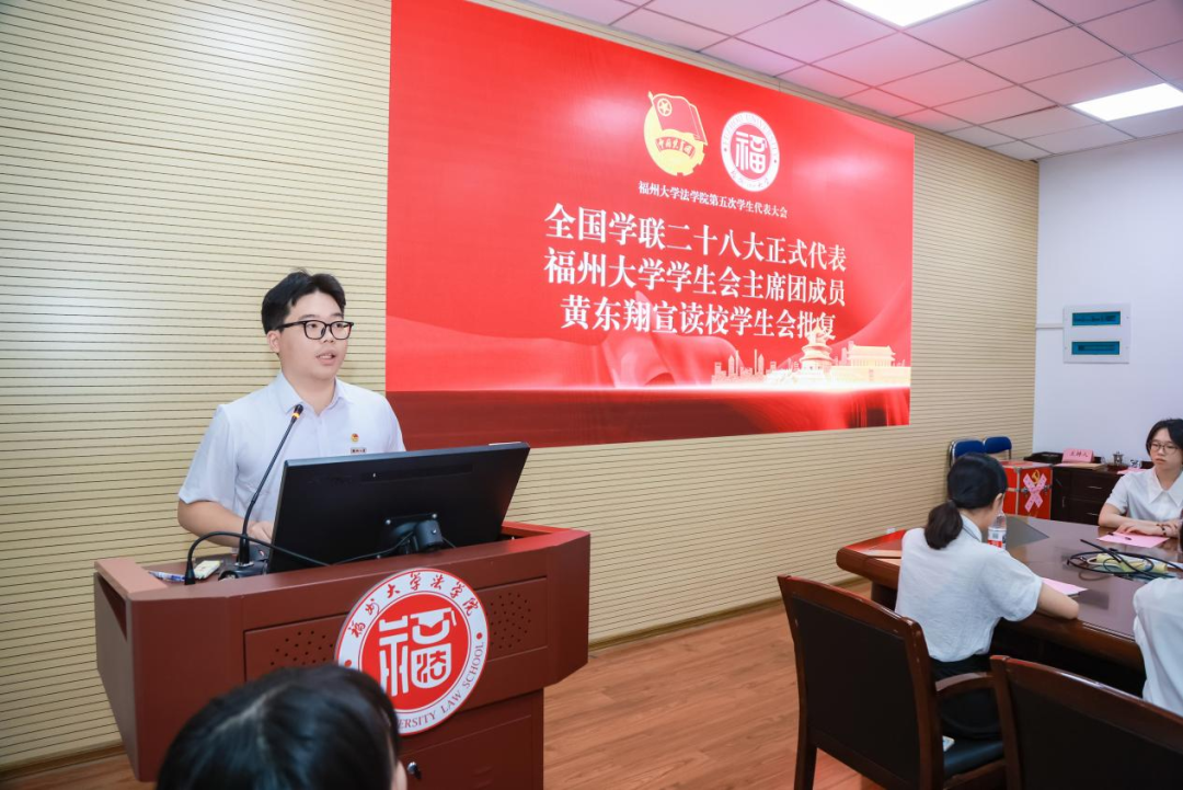 紧接着,全国学联二十八大正式代表、福州大学学生会主席团成员黄东翔同学宣读校学生会批复并致辞。他表示,本次大会是法学院学生会组织高质量发展的重要节点,是对一年来学生会组织各项工作的全面总结,鼓励法学院学生会继续强化思想引领、深入开展“我为同学做实事”,动员广大同学在中国式现代化建设中挺膺担当,争做有理想、敢担当、能吃苦、肯奋斗的新时代好青年,为奋力谱写中国式现代化福大篇章贡献青春力量。