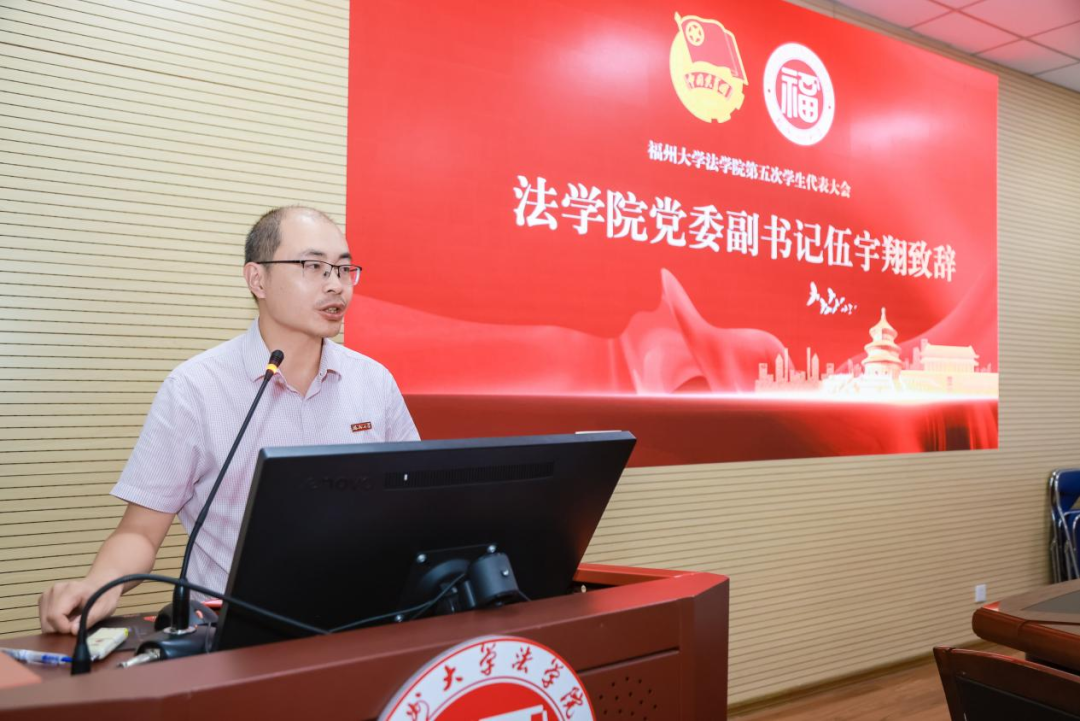 接着,法学院党委副书记伍宇翔老师致辞,他指出,学生会是推进学生组织建设、加强大学生思想政治工作和开展青年学生工作的重要力量,他充分肯定了院学生会过去一年的工作成果,并希望学生会继续改进工作方法,增强服务意识,鼓励同学们勇担时代使命,以不懈奋斗的姿态砥砺前行,为法治福建以及中国特色社会主义法治事业贡献福大青年力量。