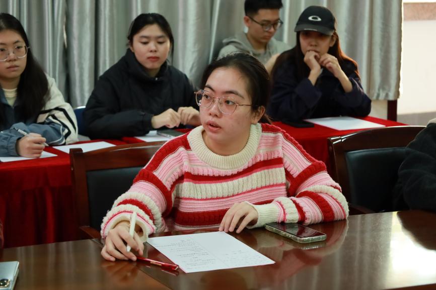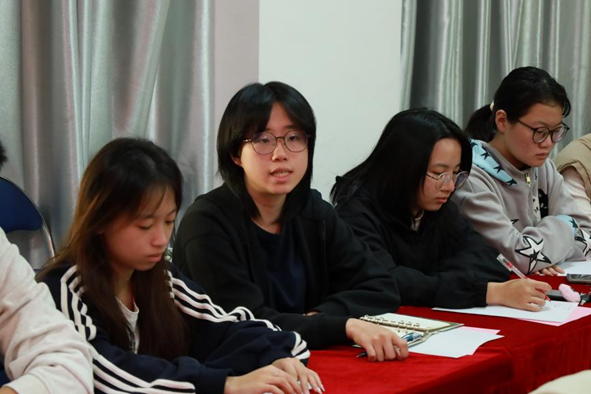 会议伊始,由李丹红老师进行领学,她带领大家重点学习了党的二十届四中全会精神及“十五五”规划纲要的核心要义。她结合思政教师配备、辅导员队伍建设、涉外法治人才培养等生动实例,深刻阐述了国家政策方针、教育强国建设与青年学子成长成才、未来就业的密切关系。她强调,广大同学应主动将个人发展融入时代洪流,顺应时代发展,不断增强自身综合能力,提升自身水平。