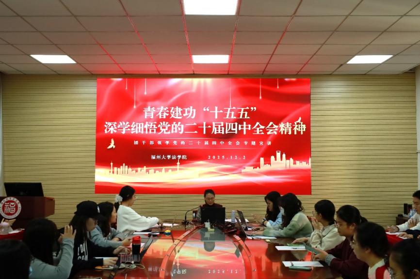 为深入学习贯彻党的二十届四中全会精神,切实转化学习成果,促进学院工作高质量推进,2025年12月2日,法学院团委学生会研究生会于法学院233办公室召开党的二十届四中全会专题宣讲会。本次会议由法学院团委书记李丹红老师领学宣讲,团委学生会研究生会各部门主要负责人参会。