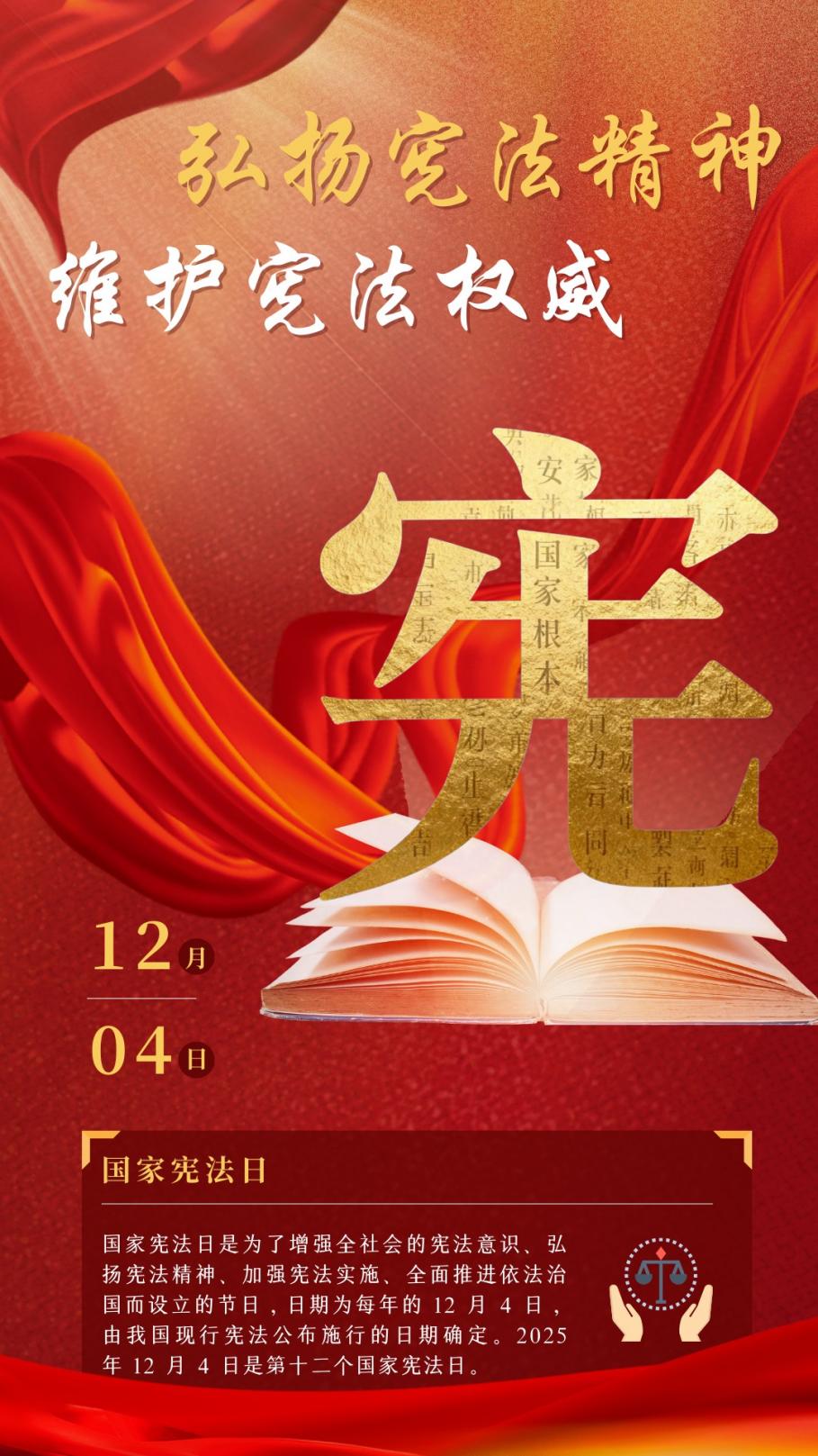 作品解读:这份海报以“弘扬宪法精神,维护宪法权威”为主题,契合12月4日国家宪法日与全国法制宣传日的宣传语境。设计上采用红色主调搭配金色元素,既呼应宪法庄重神圣的属性,也通过飘逸的红绸营造出热烈的宣传氛围;核心“宪”字融合“国家根本”等关键词,叠加翻开的书本意象,直观传递出宪法是国家基础、需要大众学习了解的内涵。意在彰显宪法的庄重性,借助清晰的信息架构,让宪法精神的传播更具渗透力。