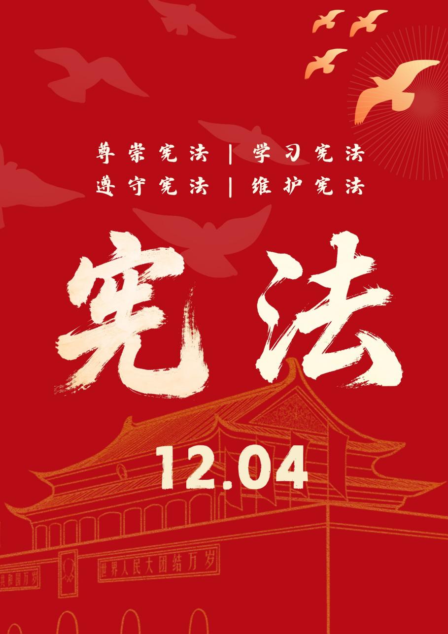 作品解读:本海报采用经典红金配色,彰显宪法的庄严与权威。版面以“宪法”二字为核心,突出“12.04”国家宪法日,四周环绕“尊荣、学习、遵守、维护”四项行动号召,形成视觉聚焦与精神环绕。底部天安门标志强化民族团结与法治共识,整体设计简洁有力,突出节日主题与法治精神。
