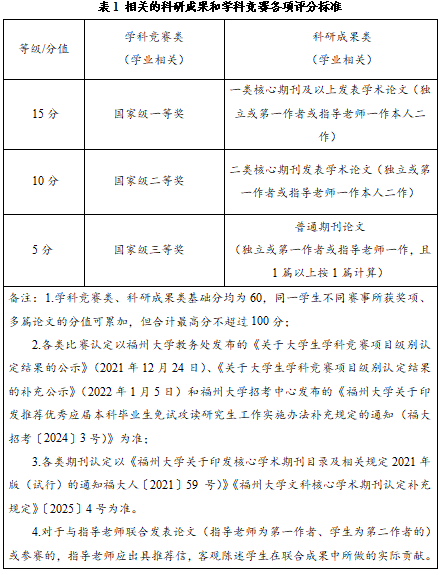 其中,综合素质测评内容涵盖科研成果、竞赛获奖、德育成绩(含学生参军入伍服兵役﹑参加志愿服务)等符合全面发展价值导向等因素。各项指标参照标准: