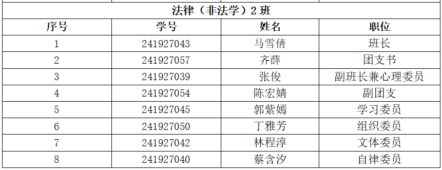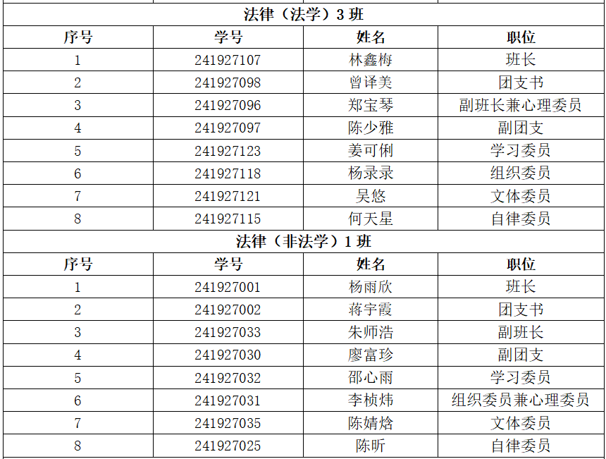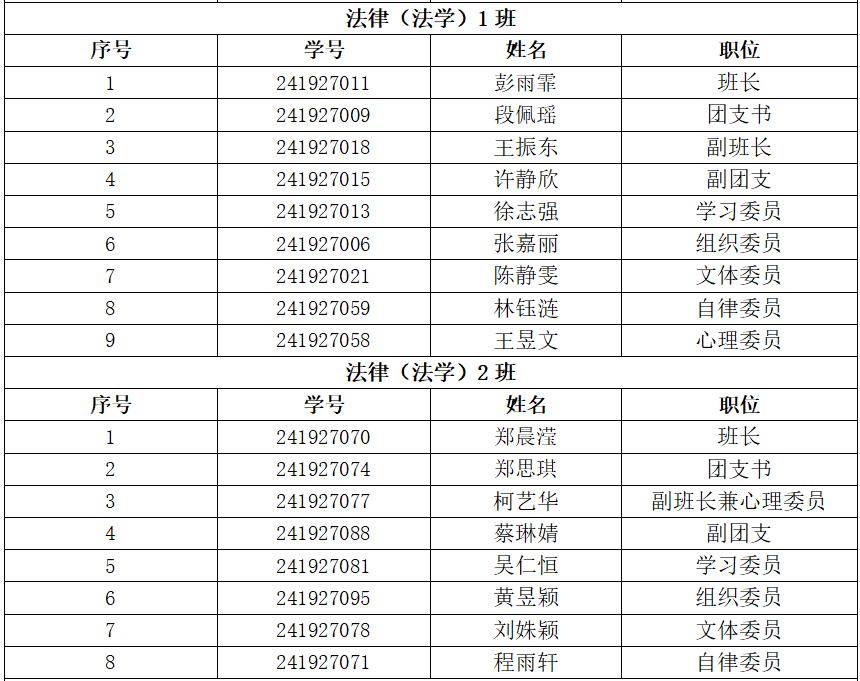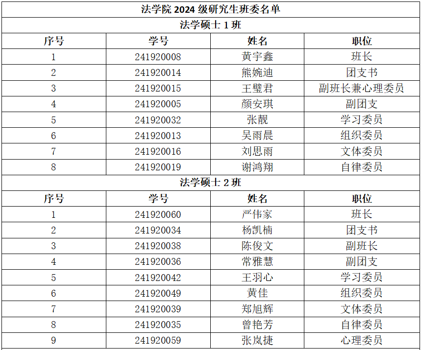 为进一步加强我院学生干部队伍建设,更好地服务广大同学,依公开、公正、择优原则,按“报名一推荐一评议一学院审核”程序,结合申报者入学以来综合表现,现将法学院2024级研究生班委任职名单予以公示。任期原则上一年,自2025年9月至2026年9月。如有异议,可致电:0591-22866283。
